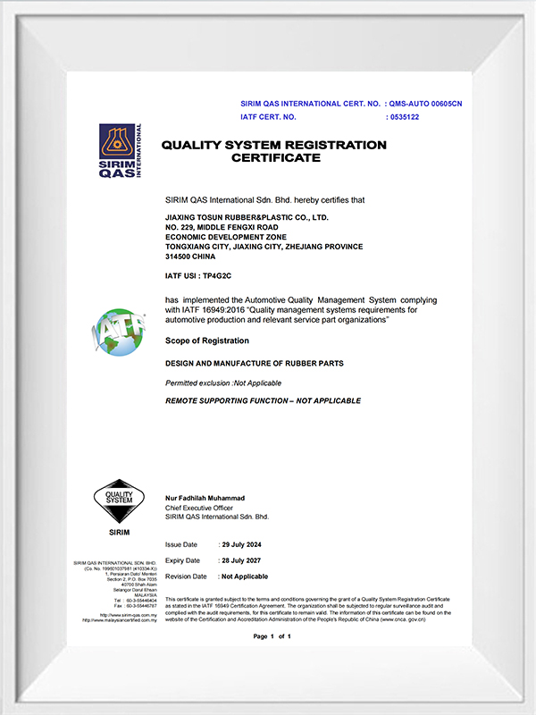 Jiaxing Tosun Rubber & Plastic Co., Ltd. sikrer høy kvalitet og effektiv levering av solide profiler gummi ekstrudering gjennom avansert produksjonsutstyr, streng kvalitetskontrollsystem, sterk produksjonskapasitet og kundesentrisk forretningsfilosofi. Enten når det gjelder produktkvalitet eller servicefunksjoner, er Jiaxing Tosun en pålitelig partner i bransjen. I fremtiden vil selskapet fortsette å opprettholde denne filosofien og tilby bedre produkter og tjenester til globale kunder.